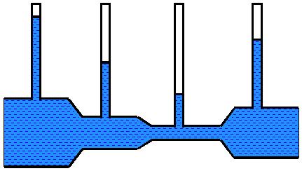 | Труба, по которой течет жидкость, снабжена впаянными в нее открытыми трубками – манометрами. В узких местах трубы высота столбика жидкости меньше, чем в широких. Это значит, что в этих узких местах давление меньше.